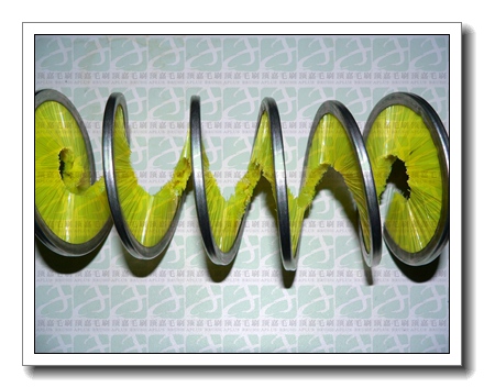 英文名Inverted brush,Spiral brush或者Screwed brush,由剛性部件(毛刷底座)和柔性部件(刷絲部分)組成,呈內(nèi)螺旋或者外螺旋狀,刷絲常見為尼龍塑料絲、金屬絲如銅絲或鍍銅鋼絲等,底座常見為鍍鋅鐵(Galvanized steel),或有不銹鋼底座,但并不多見。